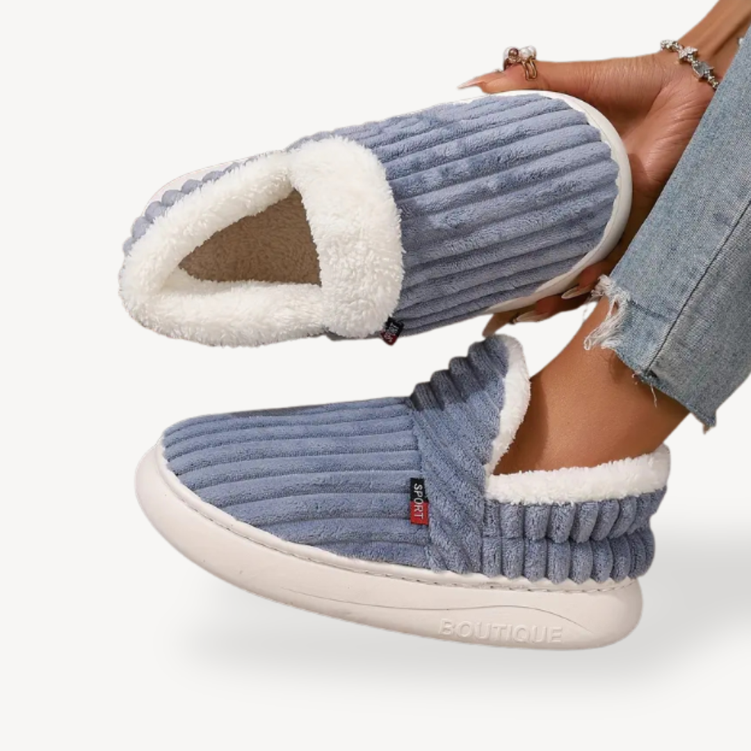 Crafted with a soft, ribbed corduroy exterior of high-quality material and a sumptuously warm fleece lining, these house boots embrace your feet in plush comfort. The integrated orthopedic design provides superior arch support and cushioning, promoting foot health and alleviating fatigue during extended wear. The durable, non-slip sole ensures stability on various indoor surfaces, making them a safe and comfortable choice. Available in a versatile array of colors including gray, blue, green, and orange, they perfectly complement your loungewear.